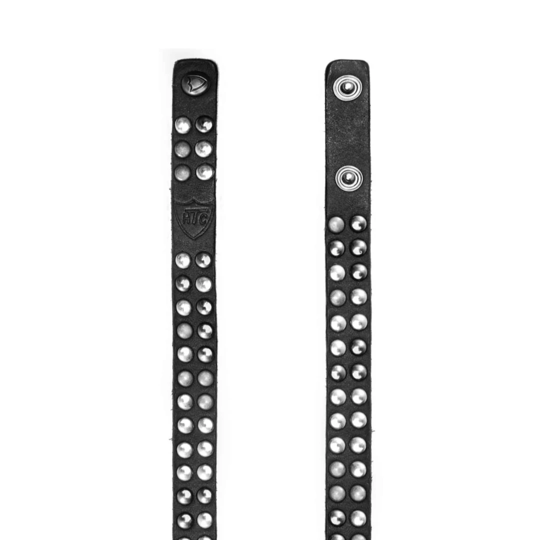 Black leather bracelet with double line studs, zamac button closure with carved HTC Los Angeles logo. 100% Made in Italy.
