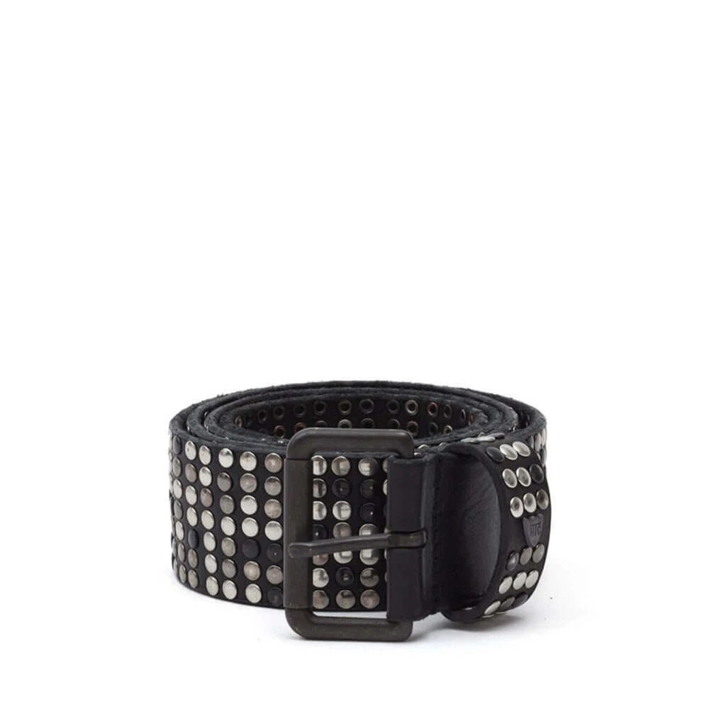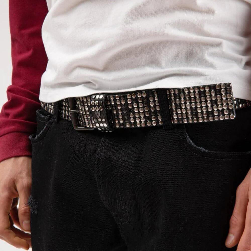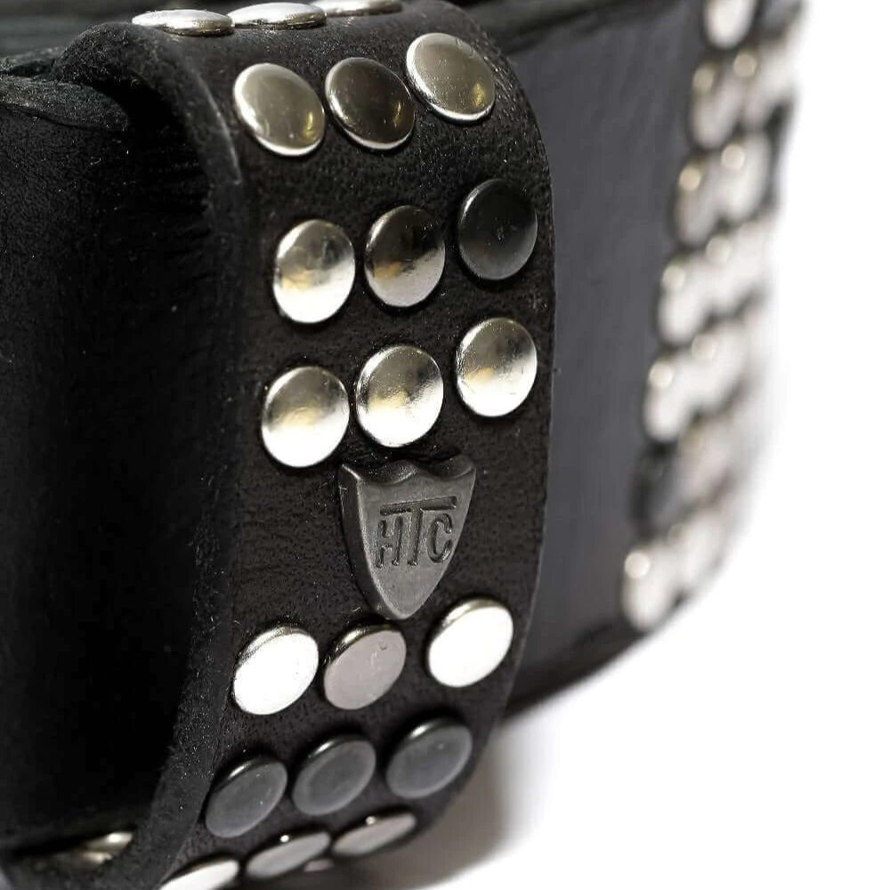 Leather belt with mixed studs, brass buckle, studded zamac belt loop with HTC logo rivet. Made in Italy.