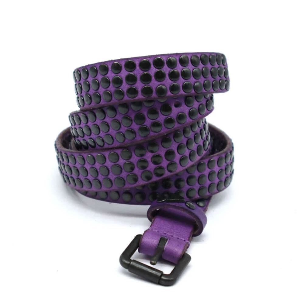 Violet Leather belt with mixed studs, brass buckle, studded zamac belt loop with HTC logo rivet. Height: 2 cm. Made in Italy.
