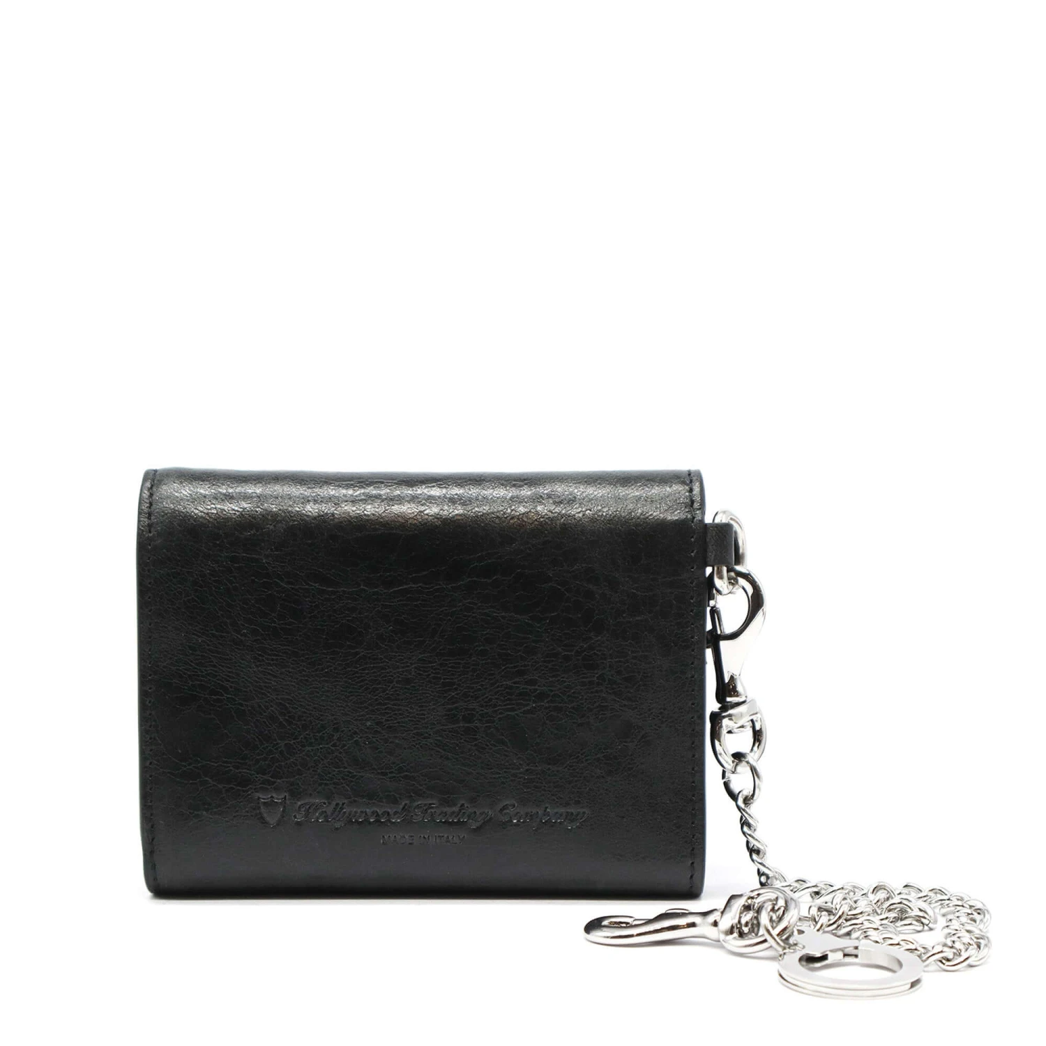 Trifold chain wallet in Black, designed with multiple compartments for cards, documents, and coins, adorned with stud details on the exterior and a chain.