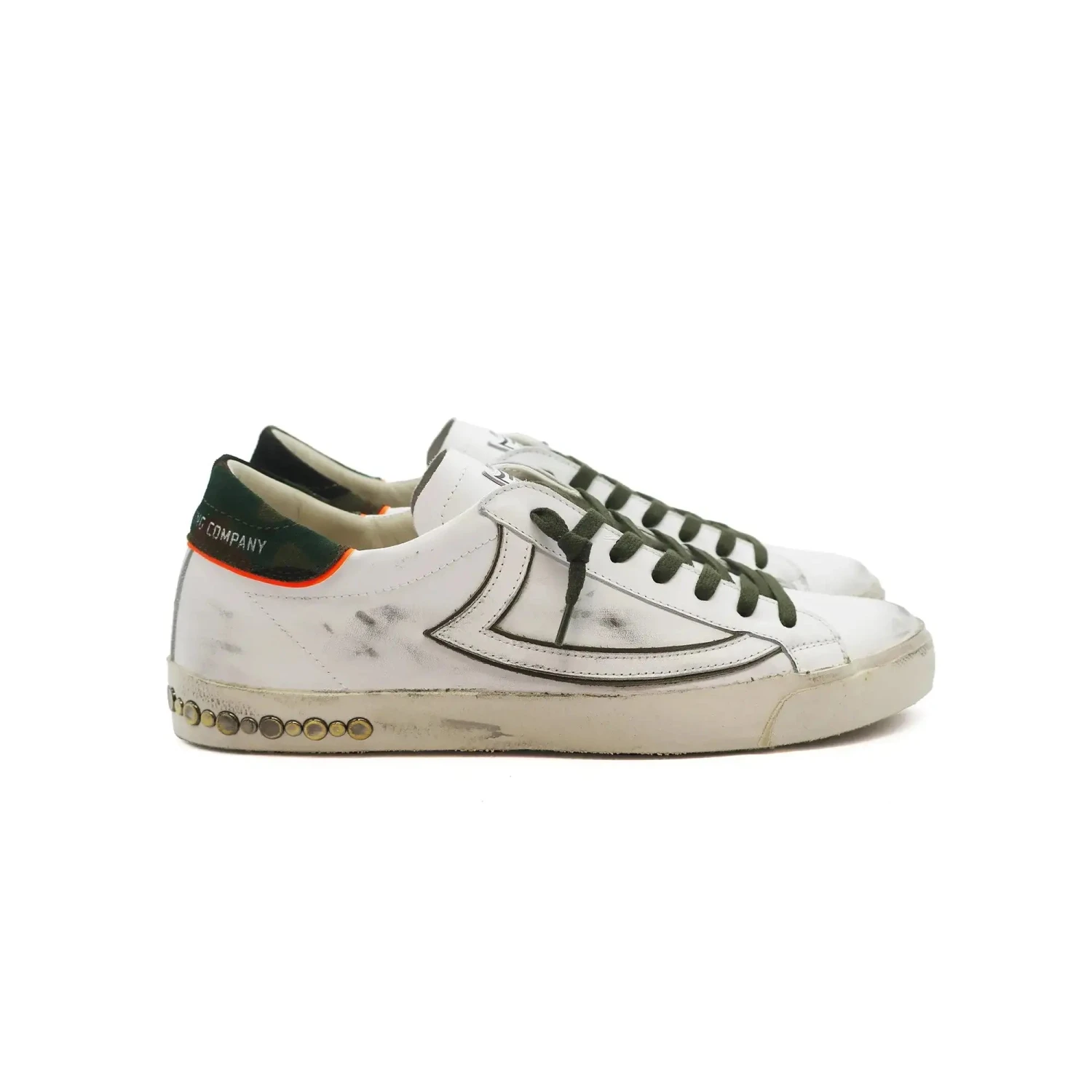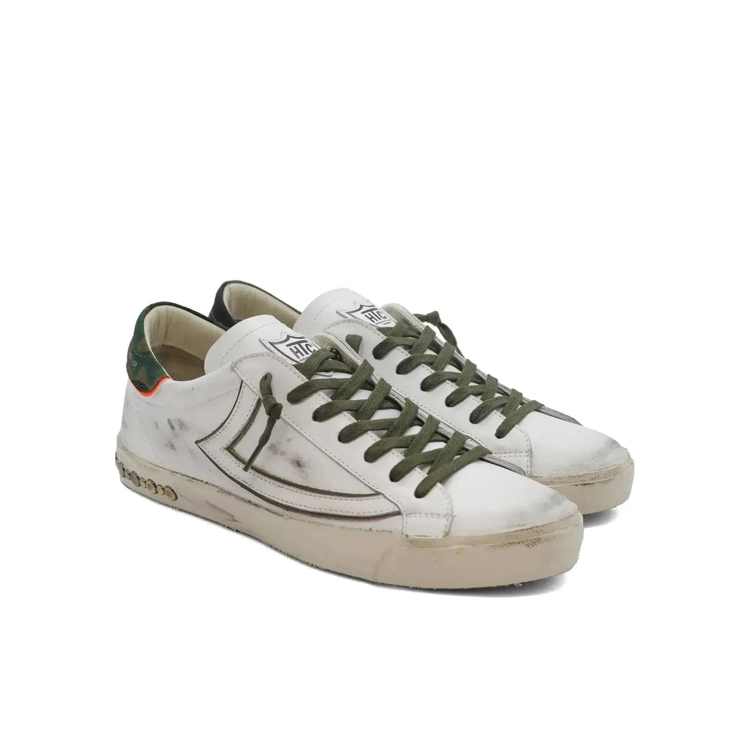 HTC VIPERS low-top sneakers in white with a distressed finish. Standard fit, providing a comfortable and flexible wrap. Front lace-up closure for a secure fit. Small logo on the tongue and large logo on the quarter. Two decorative studs on the upper heel area, featuring a camouflage print design.