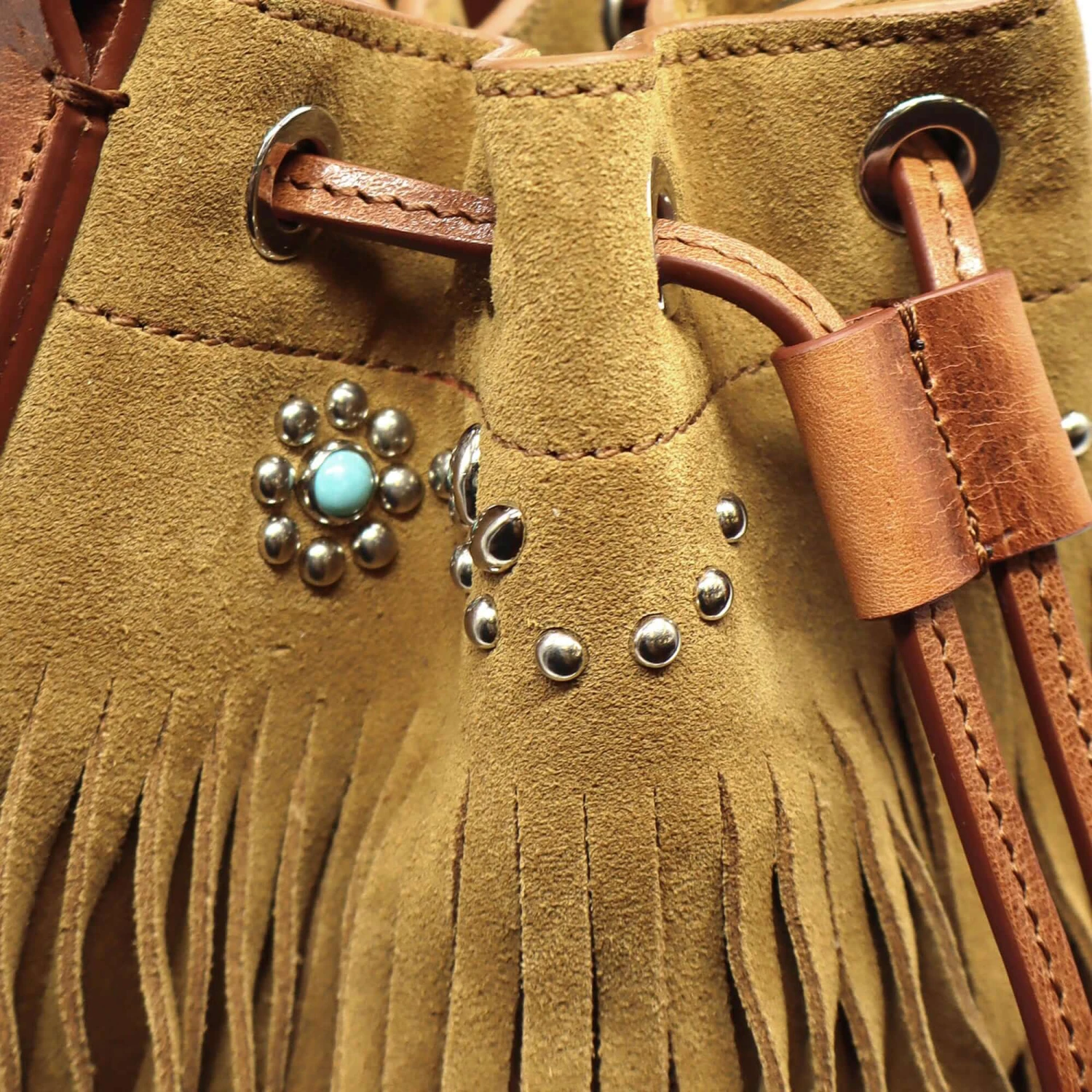 Bucket bag in Camel suede, featuring flowers studded details.Â