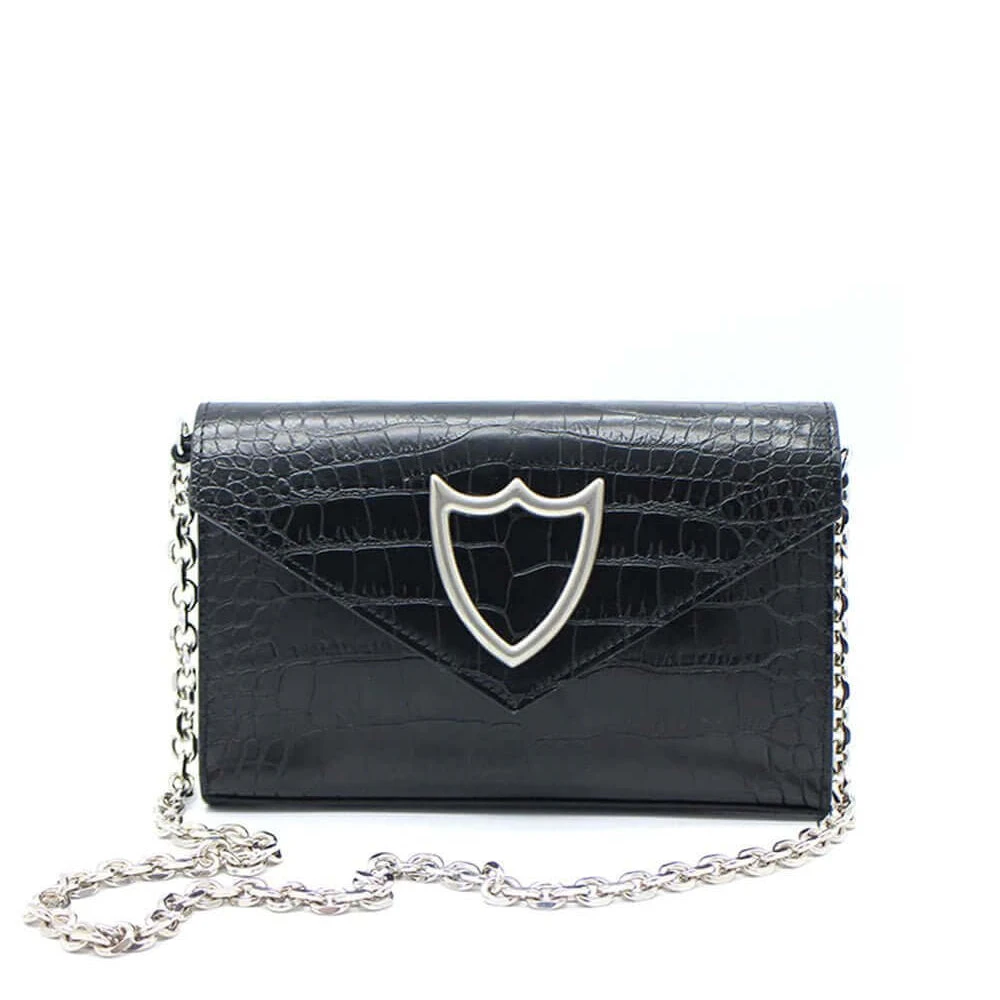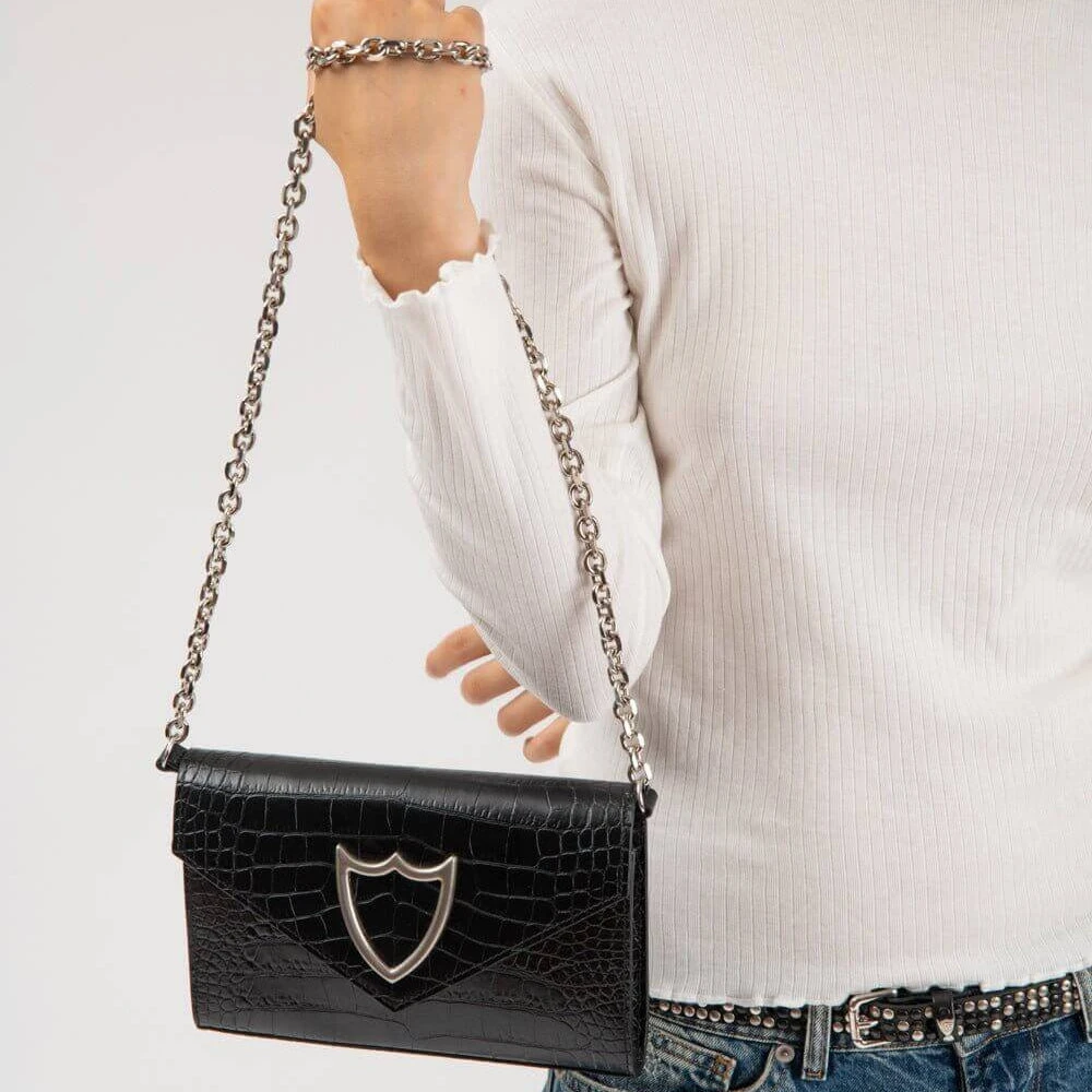 Black leather clutch. Central logo. Magnetic button closure. Leather interior. Metal chain shoulder strap