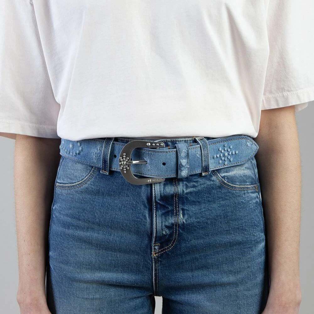 Denim belt, nickel free buckle, with HTC shield logo rivet. Height: 4 cm. Composition: 100% Cotton. Made in Italy.