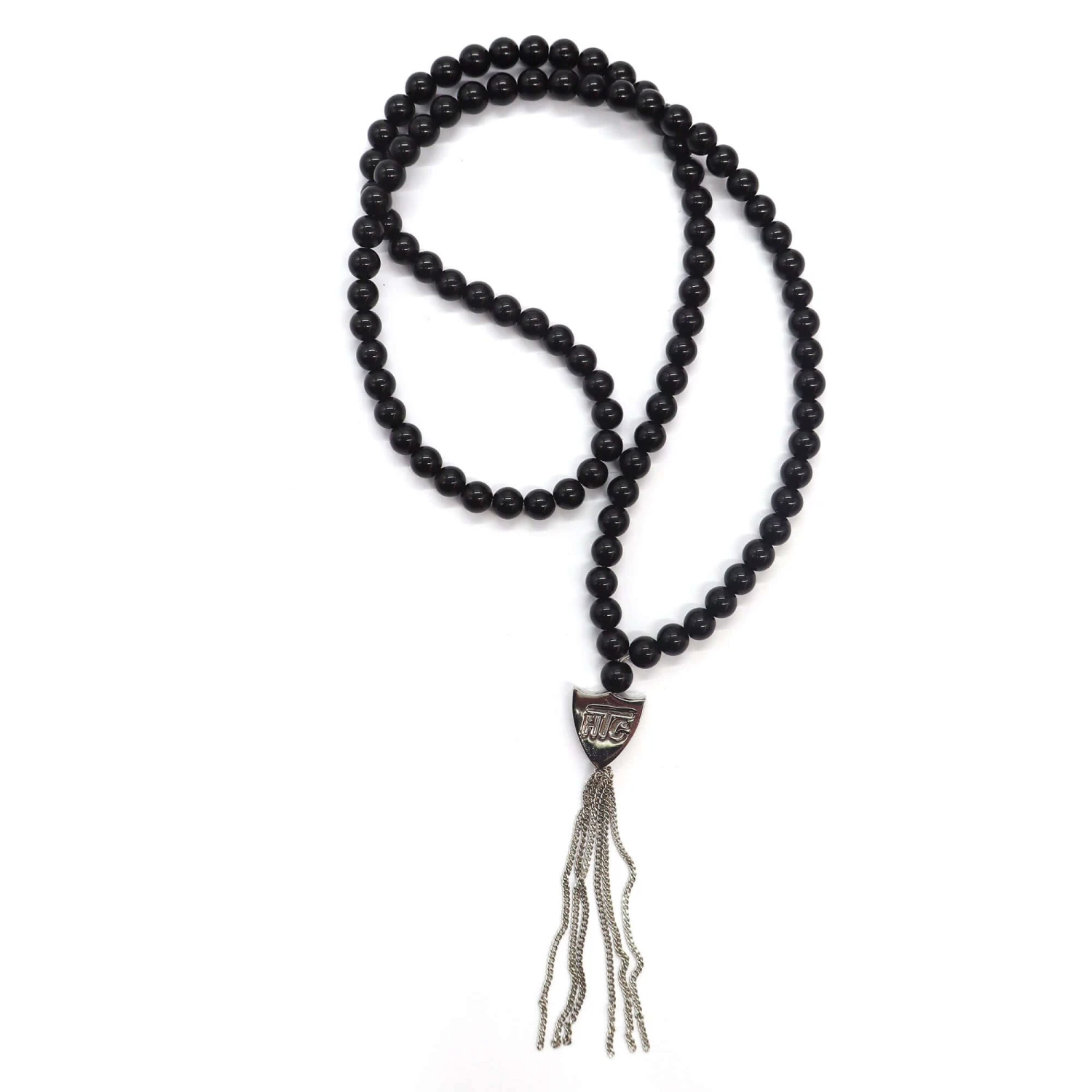 Black necklace featuring a blend of textile, glass, and metal materials, with a metal HTC logo detail.