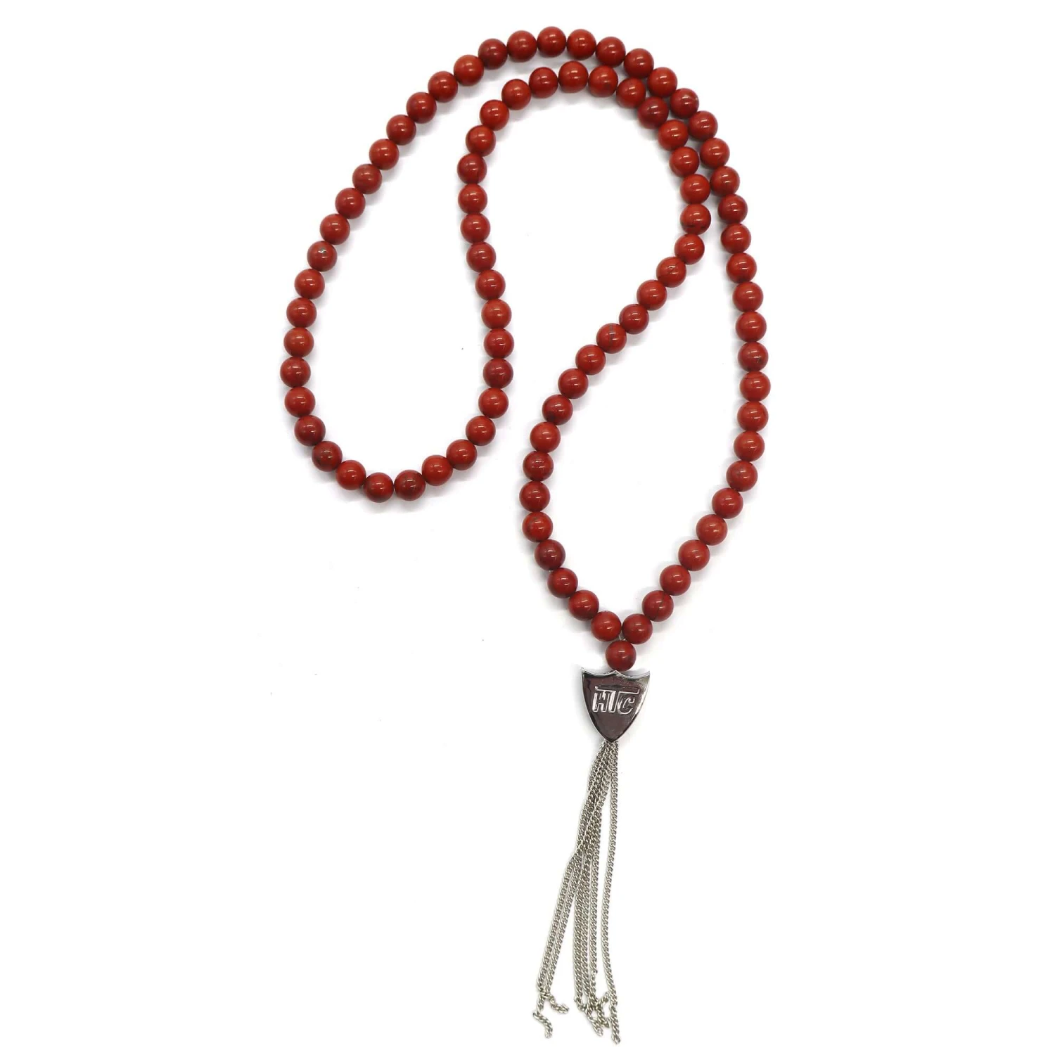 Red necklace featuring a blend of textile, glass, and metal materials, with a metal HTC logo detail.