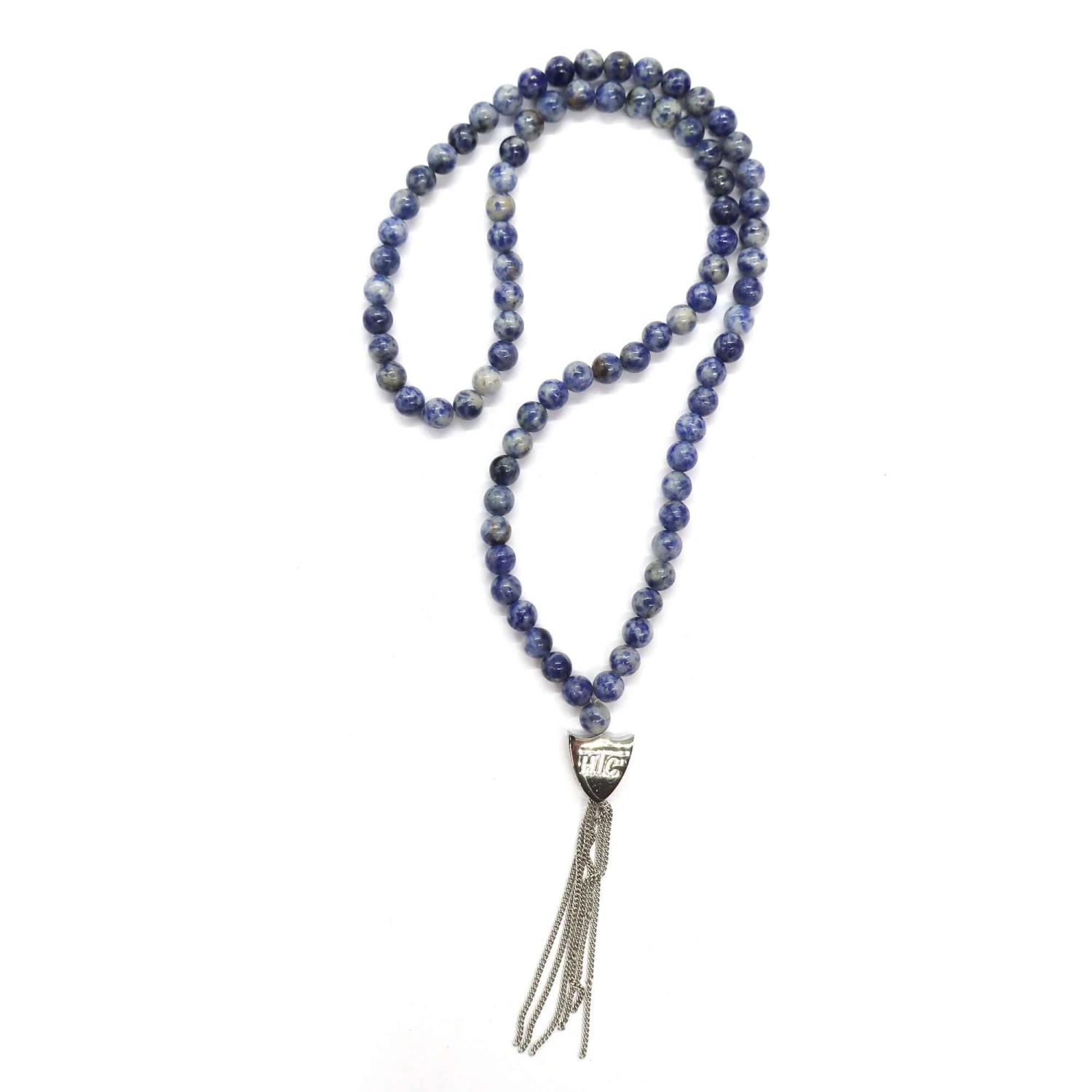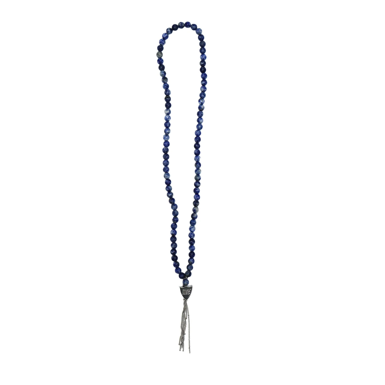 Sodalite necklace featuring a blend of textile, glass, and metal materials, with a metal HTC logo detail.