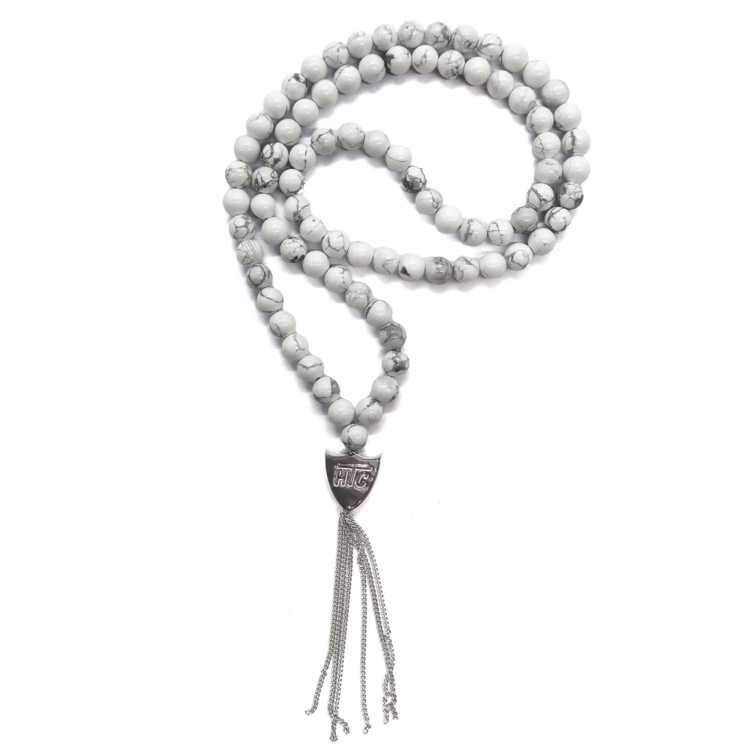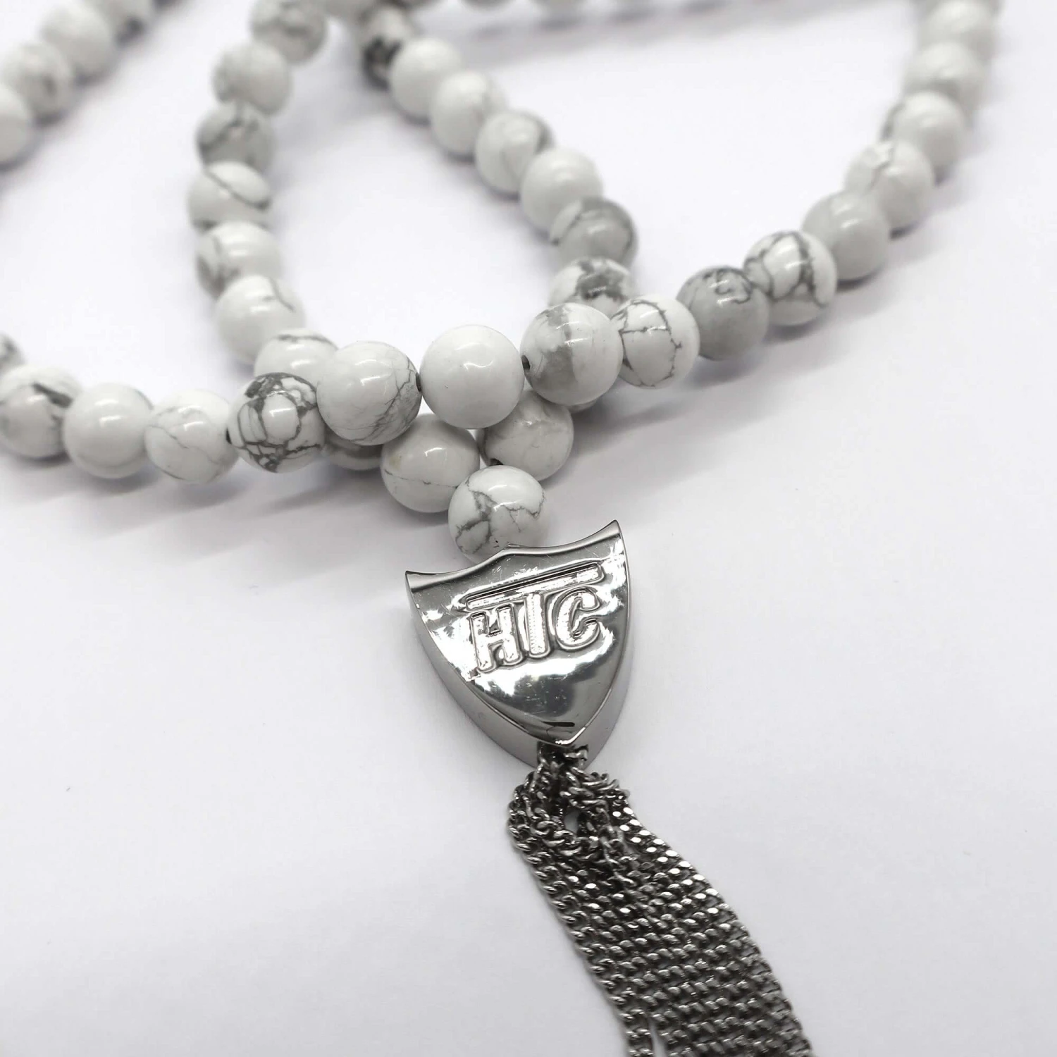 White necklace featuring a blend of textile, glass, and metal materials, with a metal HTC logo detail.