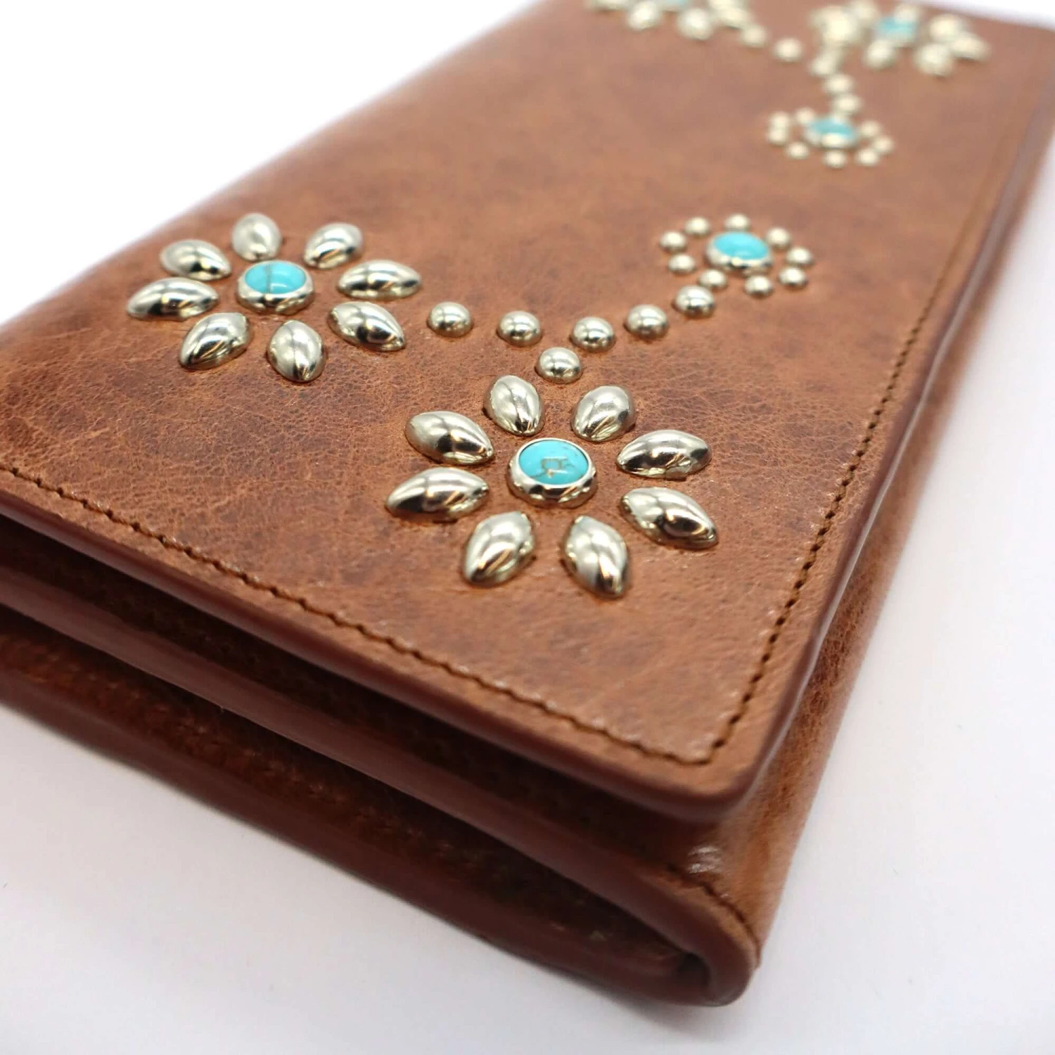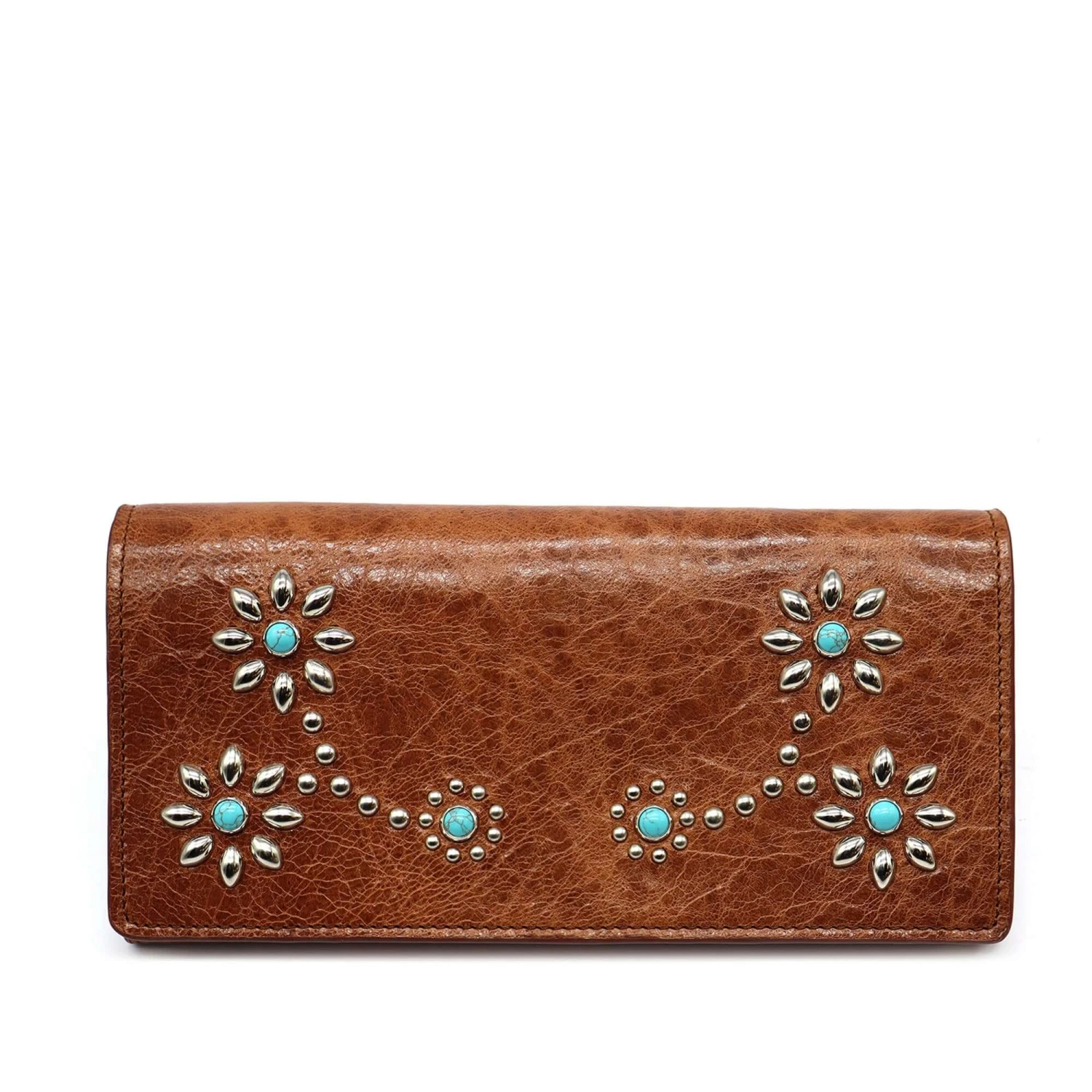Long wallet in Cognac, featuring a button closure. Designed with compartments for cards and coins, with flower studded details on the exterior.